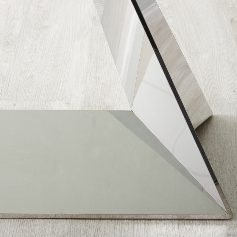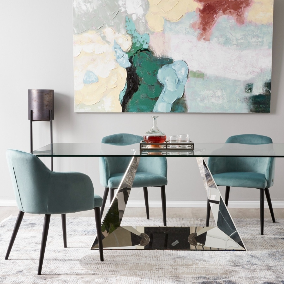 Complementing the stunning glass top is a sleek and stylish frame that exudes geometric beauty. Meticulously polished to perfection, the frame adds a sense of modernity and refinement to the overall design. Its clean lines and expert craftsmanship elevate the Zephyr Dining Table to a new level of sophistication, making it a focal point that effortlessly enhances your dining area. Impress your guests and create unforgettable dining experiences with the Zephyr Dining Table. Pair the Zephyr with an ensemble of our beautiful Dining Chairs.